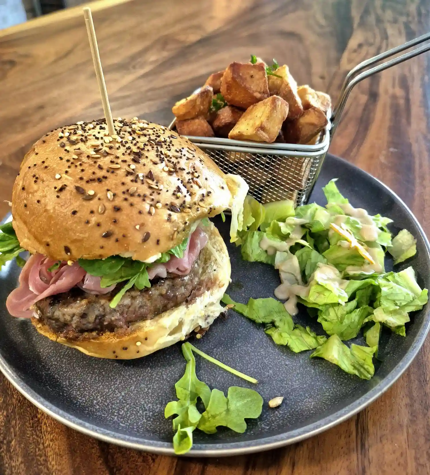 Pain Artisanal, Steak Angus, Tomate, Salade, pesto, Jambon Sec, Mozzarella et Parmesan